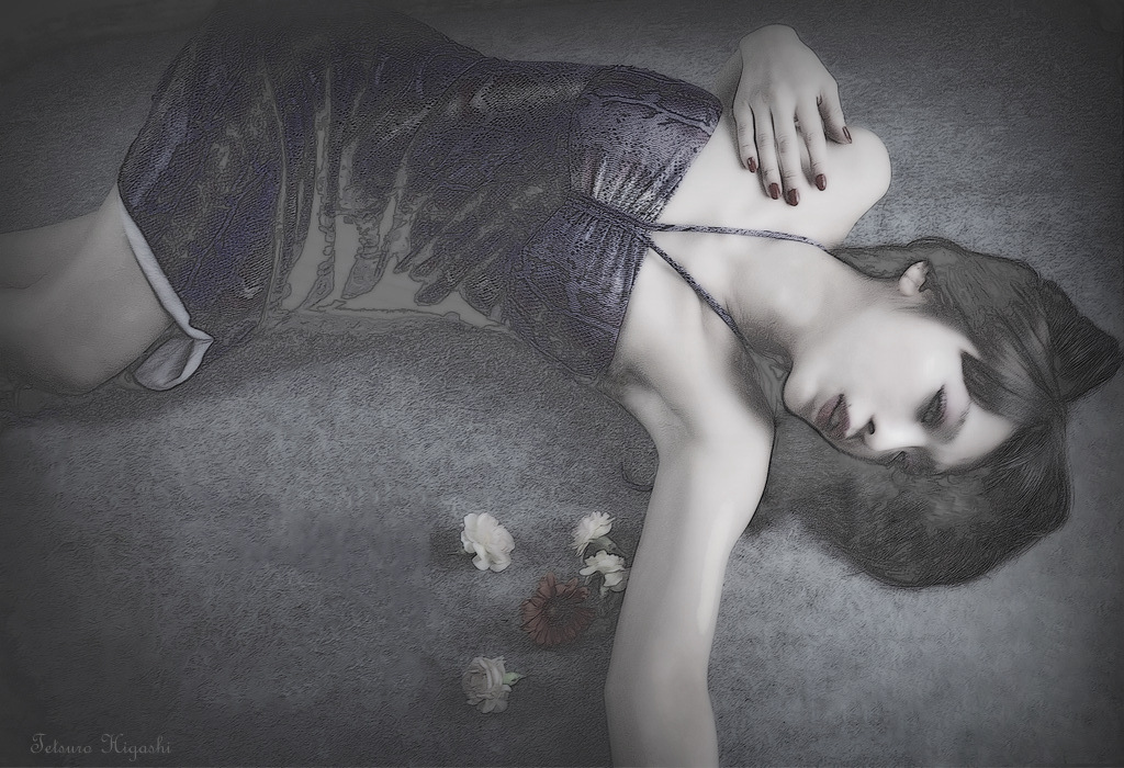 この写真はとても分かりやすいので、参考にしながら詳細を説明していきます・・・この画像が興味深く思える方は参考にしてください。 先ず、こういう画像にするためには、暗めに撮ってください。 写真から、その画像の輪郭だけを浮かび上がらせる(スケッチ加工)をしてみてください。 この画像をコピーして、拡大してみれば分かると思いますが、輪郭が強調されてます。 この編集によって、画像の明るさは増し、編集もしやすいと思います。 体のラインを見れば分かるように、強くラインが出ている箇所とそうでない箇所があります。 ここからは、”絵心”が必須になります。 どこもかしこも(ラインが)強くなれば、きつい印象になってしまいます。 それを回避するために、画像を拡大して(無駄と思われる)ラインを消して行きます。 鼻、口、顎あたりの輪郭はかなり強く出てますが、これは肌の白さと背景の髪の黒とのコントラストが強いことで生まれる「ライン」です。 明暗のコントラストの差が少ないところは、ラインが出てきません。 それと、グレーに見える箇所で、(ある種の色潰れを起こし)本来であれば真っ黒に見えるとこがグレーに反転するようになります・・これは、編集ソフトがクラッシュした状態になっていると思われます。 ラインが整ったら、ざらついた質感を整えるために「デジタルノイズを省く」編集をしてください。 「ソフト加工」は止めて方がよいです・・画像がボケてしまいます。