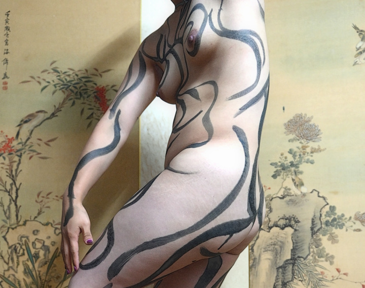 人肌に墨絵を描いていく