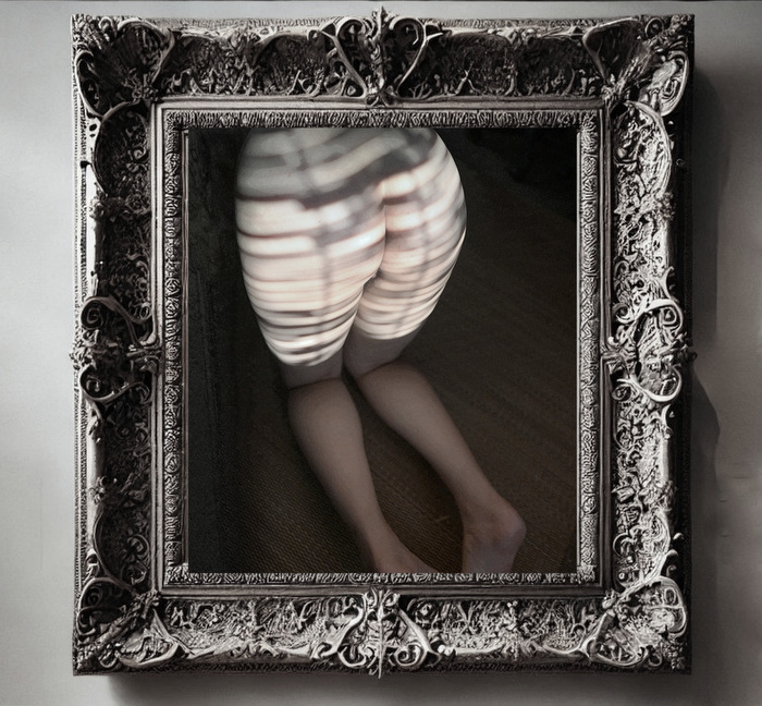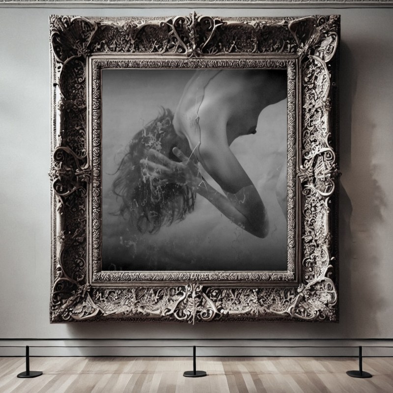 装飾豊かな額に入れられた飾らぬ生なヌード