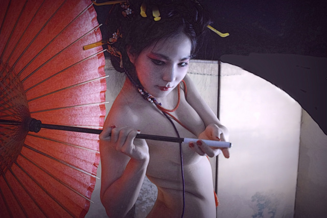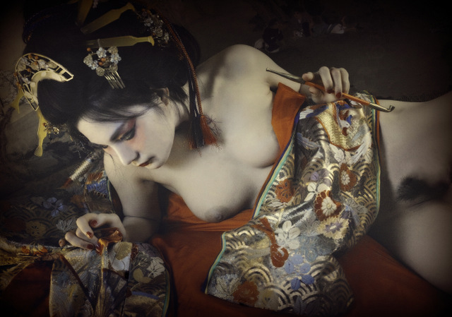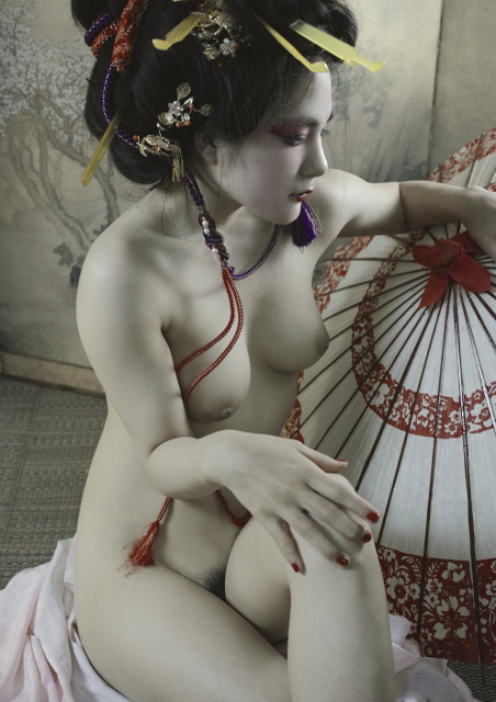 An image of a Japanese courtesan. “Of course, the model doesn’t work as a courtesan.” She became nude for the first time in my shoot, in order to become a courtesan. Through this shoot, I became a world-famous photographer, and she also became a world-famous model (in the EU). For me and her, it was a monumental encounter, and a wonderful work was born.