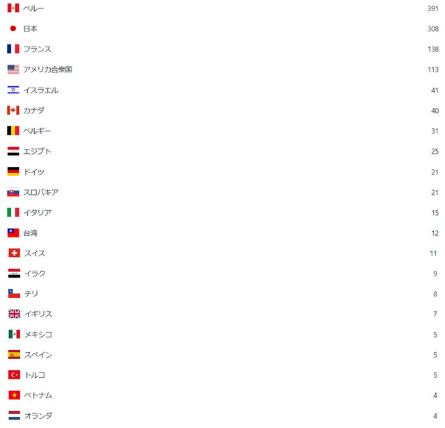 3位以下は、イタリア、アメリカ合衆国、メキシコ、トルコ、イラン、